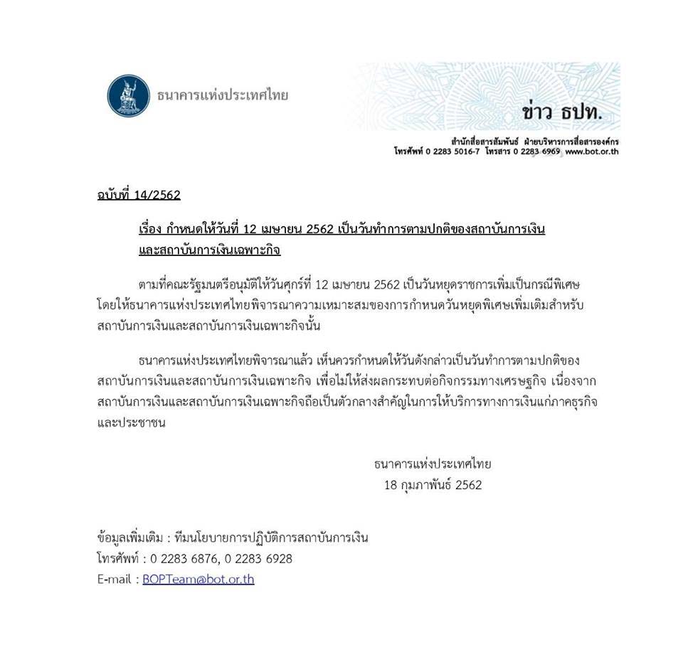 | วันหยุดธนาคาร และราชการ ประจำปีพ.ศ. 2562 |
