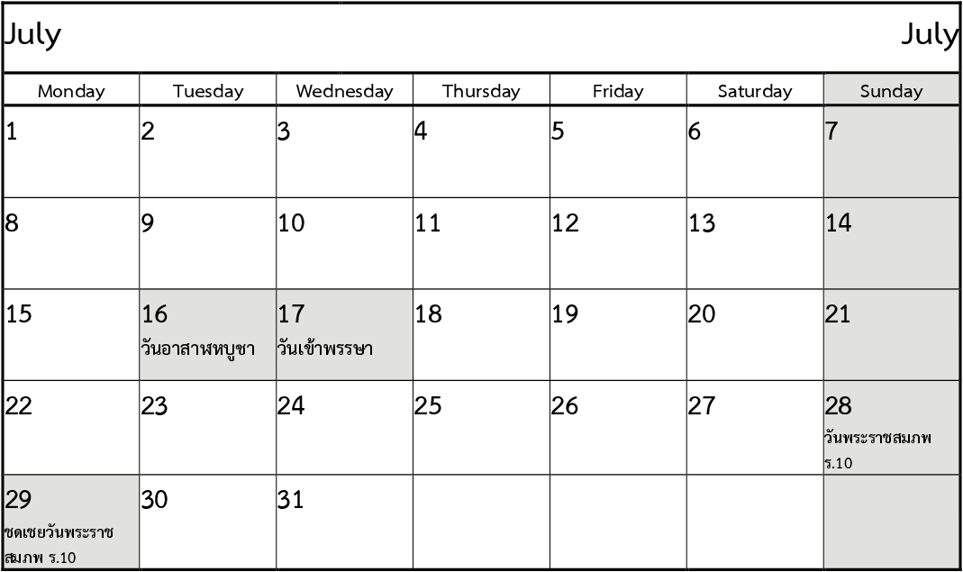 วันเข้าพรรษา (Buddhist Lent Day) (ธนาคารไม่หยุดวันนี้) (วันแรม 1 ค่ำเดือน 8) |
