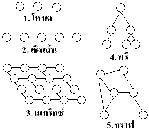 คือ รูปแบบของการจัดระเบียบของข้อมูล ซึ่งมีอยู่หลายรูปแบบ เช่น เขตข้อมูล(Field) แถวลำดับ(Array) ระเบียน(Record) ต้นไม้(Tree) ลิงค์ลิสต์(Link List) เป็นต้น (ทักษิณา สวนานนท์, 2544, หน้า 161) [4]p.12