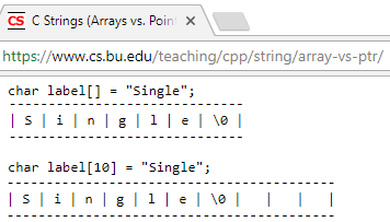 ไปอ่านโพสต์แนวข้อสอบ while กับ for เค้าถามว่าทำกี่รอบ แต่สิ่งที่คุมจำนวนรอบ คือ จำนวนตัวอักษรใน array of character และค่าของสมาชิก มีการใช้ function ดำเนินการกับ array อาทิ strlen, strcmp, strcat, strcpy เป็นต้น แต่เมื่อไปอ่านใน Webpage ของ Robert I. Pitts หรือ myers พบว่า มีการประกาศ Array แบบไม่กำหนด size แต่คำนวณอัตโนมัติคือเท่าขนาดข้อมูล (char label[] = "Single";) กับกำหนดขนาดชัดเจนและอาจเกินที่จำเป็นต้องใช้ (char label[10] = "Single";) ส่วนที่ marcuscode.com ก็อธิบายเรื่องอาร์เรย์ได้เรียบง่ายดีมาก ผ่านการใช้งานด้วยภาษา C