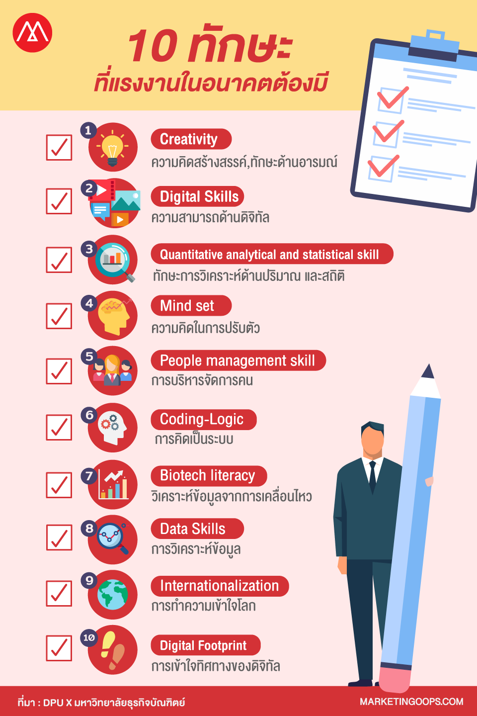 อ่านจาก Weforum.org , Linkedin.com และ Nowasu พบว่า รายงานของ World Economic Forum พูดถึง 10 ทักษะที่บริษัททั่วโลกต้องการ ที่เก็บรวบรวมจากเว็บไซต์จัดหางาน LinkedIn ที่เป็นทักษะของผู้ใช้งานที่ได้รับการว่าจ้างสูงสุด จากสมาชิกของ LinkedIn 100,000 คน แบ่งเป็น 5 Soft Skills ได้แก่ 1) ความคิดสร้างสรรค์ 2) การพูดโน้มน้าวผู้อื่น 3 ) การทำงานร่วมกับผู้อื่น 4 ) การปรับตัว 5 ) การบริหารเวลา 5 Hard Skills ได้แก่ 1) การใช้งานระบบคลาวด์และเครือข่าย 2) การใช้ปัญญาประดิษฐ์ 3) การวิเคราะห์เชิงเหตุผล 4) การบริหารบุคคล 5) การออกแบบประสบการณ์ให้กับผู้ใช้งาน